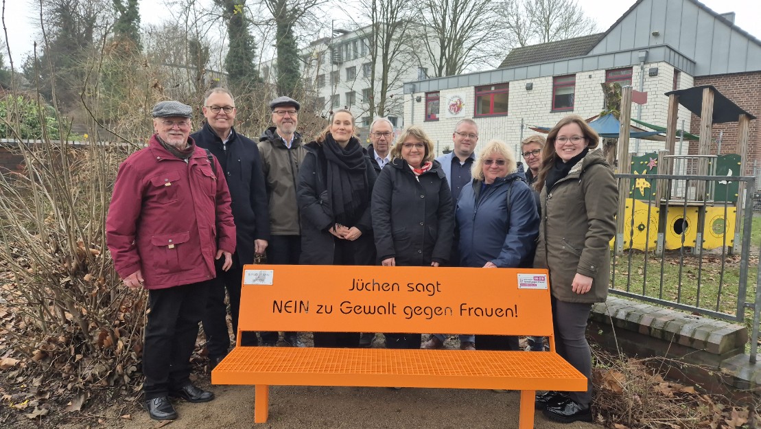 Die Einweihung und offizielle Aufstellung der Bank erfolgte nunmehr am 28.01.2026, um 14 Uhr, im Beisein des Bürgermeisters der Stadt Jüchen, Herrn Philipp Sieben, den beiden städtischen Gleichstellungsbeauftragten Frau Schiffer und Frau Schmitz, der Leiterin der Frauenberatungsstelle des Rhein-Kreises Neuss, Frau Schmeinck, und Mitgliedern des Stiftungsrates und des Vorstandes der Bürgerstiftung Jüchen.